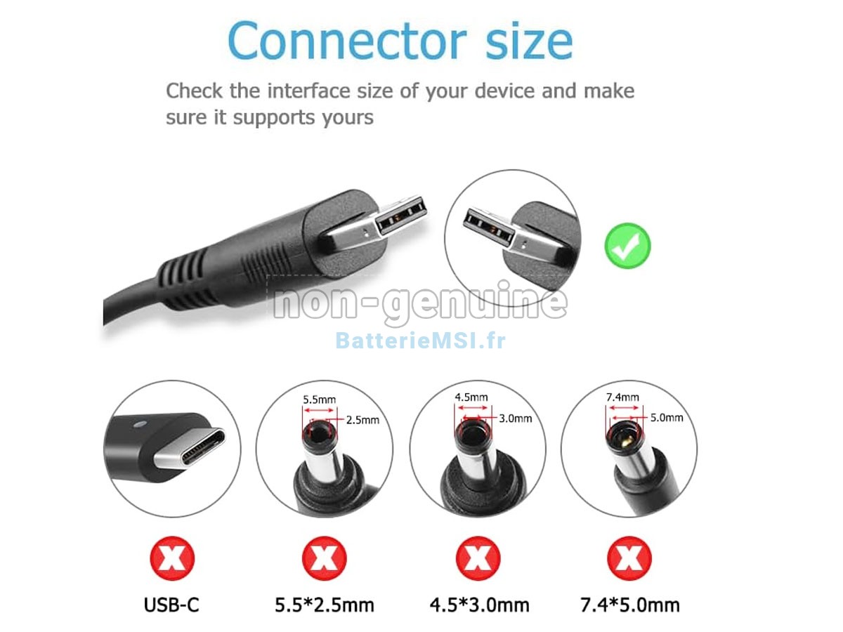 Toutes les adaptateur vendues sur BatterieMSI.fr sont des pièces de rechange. BatterieMSI.fr n'est affilié à aucun des fabricants d'origine. Toutes les marques déposées ou noms de modèles répertoriés ci-dessus sont identifiés uniquement à des fins de compatibilité.