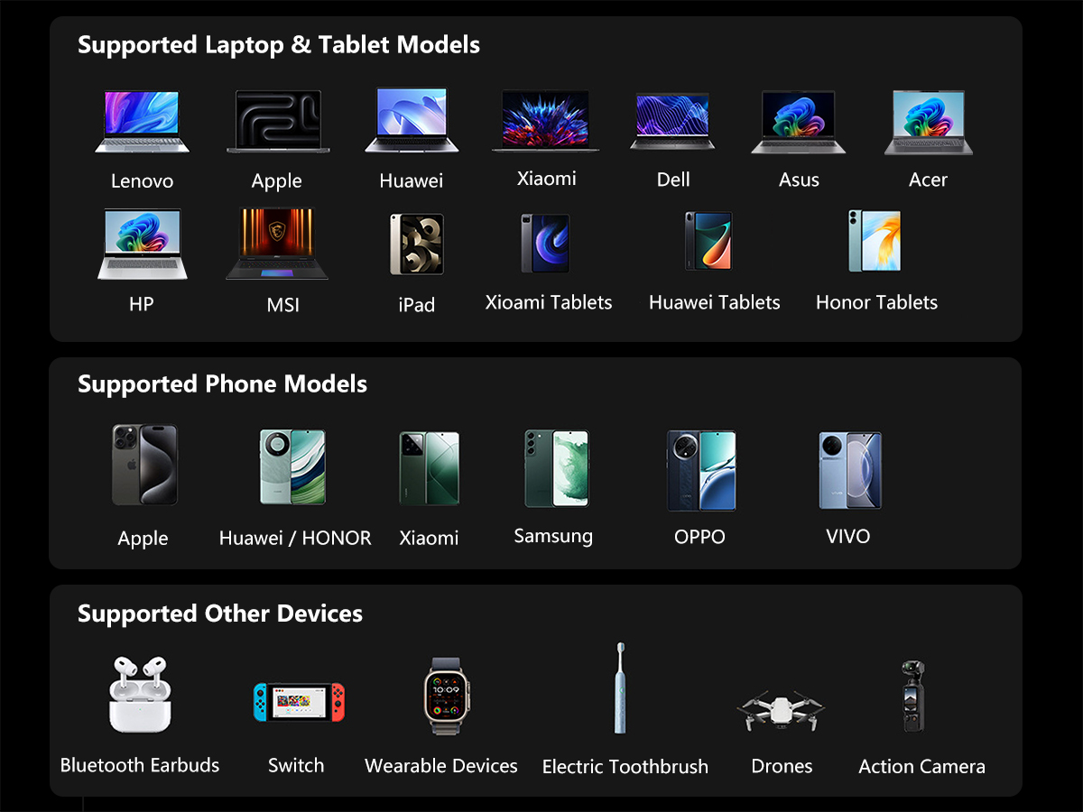 Oui. Cette batterie externe délivre une puissance réelle de 100W, aussi bien via le câble USB-C rétractable intégré que par le port USB-C (jusqu’à 20V/5A). Elle est parfaitement adaptée à la recharge des ordinateurs portables USB-C, comme le MacBook Air, ainsi que des tablettes et autres appareils à forte consommation. La prise en charge de PD 3.0 et de plusieurs protocoles de charge rapide garantit une recharge rapide, stable et efficace.